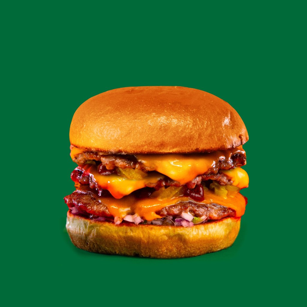 Americká brioška grilovaná na másle, 3x mleté hovězí(65g), čedar, cibule, americké a nakládané okurky, omáčky (medová majonéza, bbq a hořčičný dip).