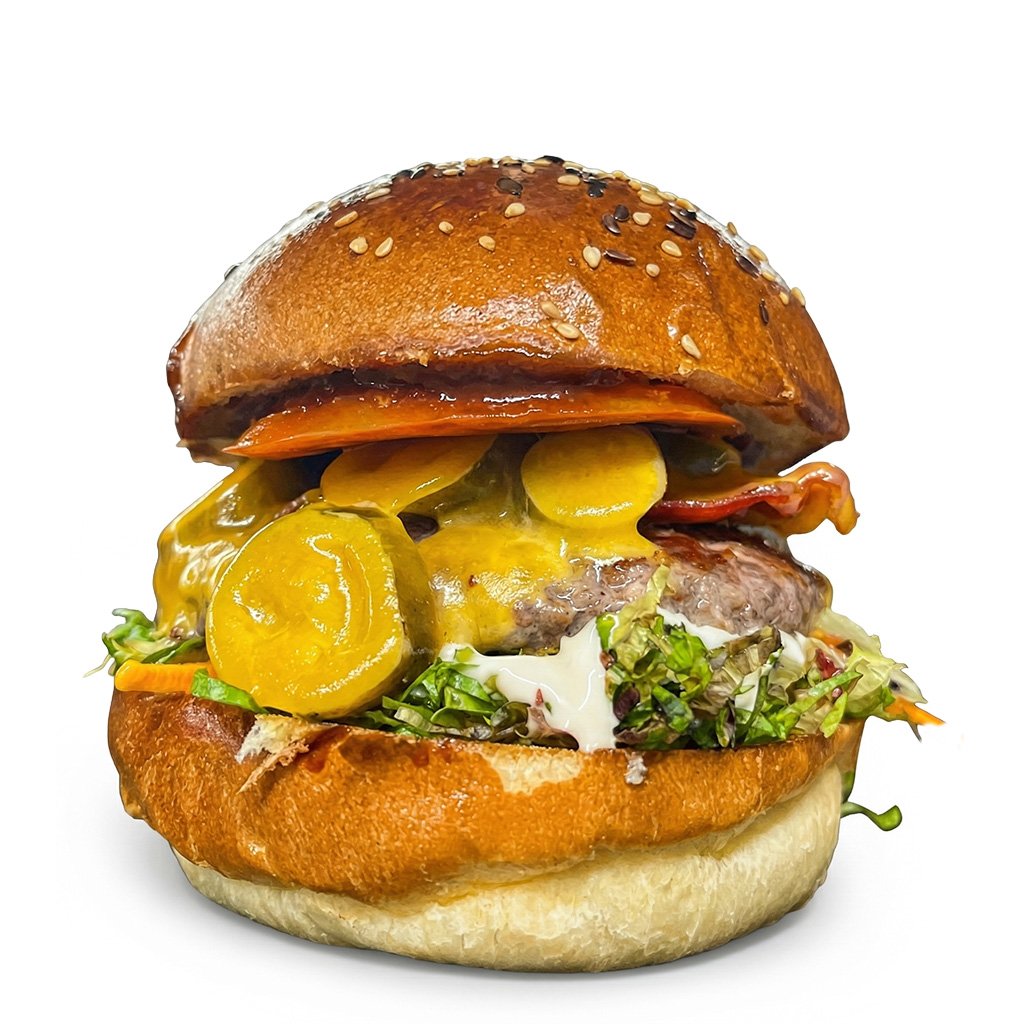 Bulka grilovaná na másle. Mleté hovězí(100g), slanina, čedar, jalapeňos, rajčátka, salát, cibule, omáčky (bbq, medová majonéza a hořčičný dip).